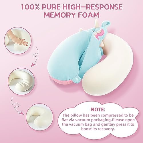 Memory Foam Travel Pillow: The unicorn U-shaped neck pillow is filled with 100% pure high-response memory foam cushion which can easily to be any shape as needed and getting back to original shape within 3 seconds.【NOTE:The pillow has been compressed to be flat via vacuum packaging. Please open the vacuum bag and waiting for it expand to a pillow within 48h.】